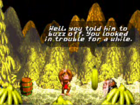 • Donkey Kong never returns to the banana hoard at any point in the ending, yet the text where Cranky tells him to go back there for a surprise remains.