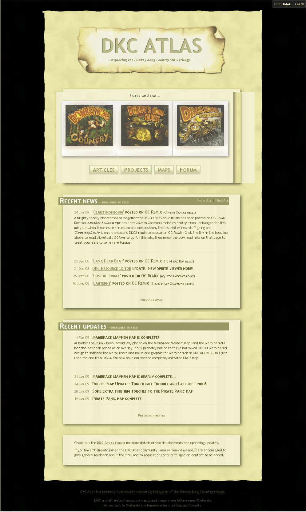 Thanks for the feedback, guys. All of the points you've brought up will be addressed, and many are already being worked on. DKC Atlas has always been 800 x 600 optimised, but I'm developing a 1024px wide redesign for the site and forum. Should be a lot nicer for 99% of users. Those with old monitor setups will just have to scroll a bit. ;)