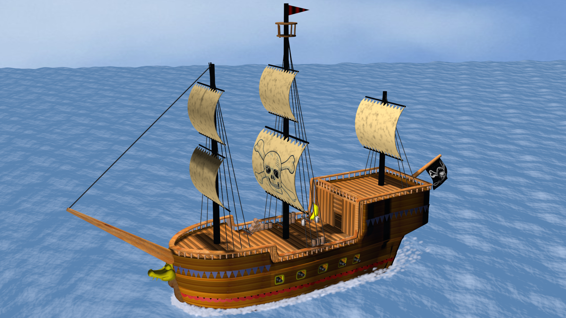 Phyreburnz wrote:I know that the DKC 2 ship has only one sail per mast, but I suggest adding some more, like having two per mast on the front two masts. Having just one sail per mast seems a bit more cartoony to me.