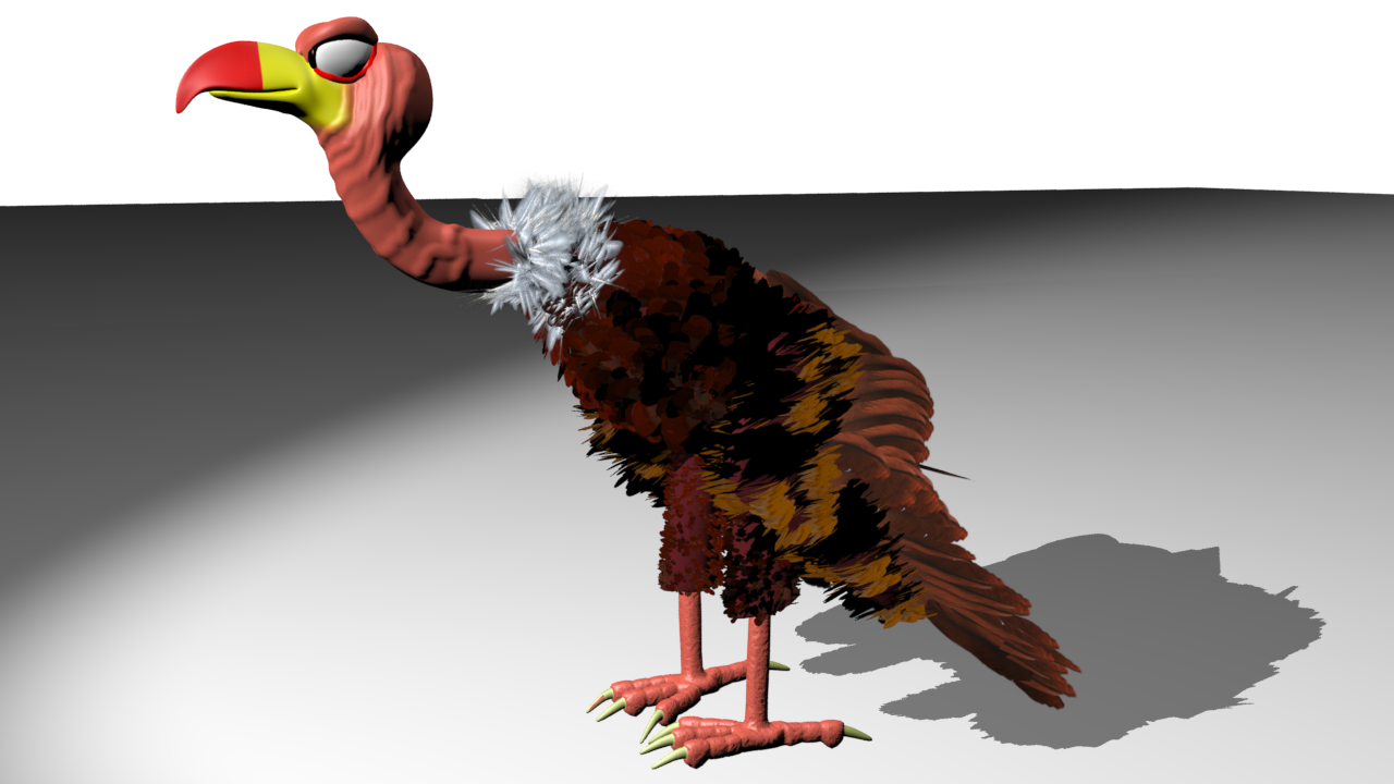 Here is a new version showing a different angle and with fixed feathers. Still a few not following the rules. Bad feather you. Also this is a wrong pose as his body is in a flying pose not standing like a bird would be doing with his wings folded like that. Still need to rig the body, neck and feet.