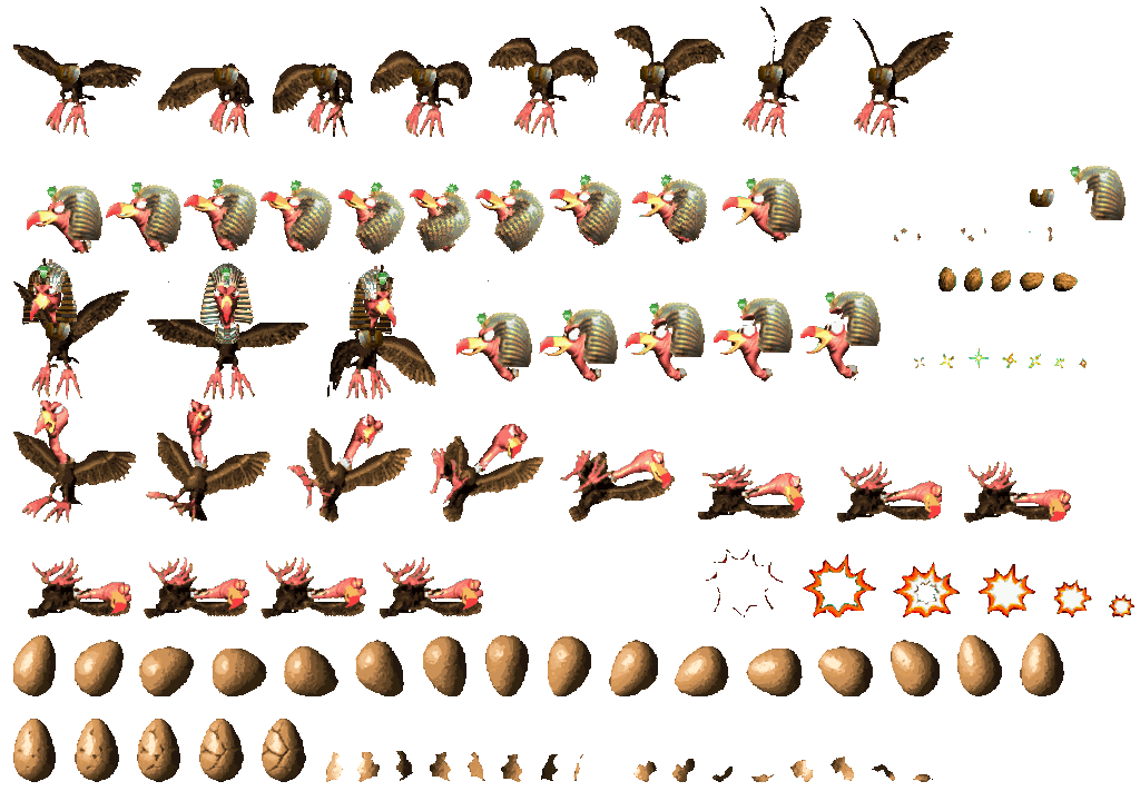 I clipped it off Google after searching 'egyptian headdress', then 'egyptian headdress side view'; I can't remember exactly what site it came from though. Also, I forgot to mention; the reason the death sprites lack a headdress is because I thought it'd be cool if the two pieces on the right above the nut and dizzy stars went flying off upon death, and bounced around a bit, kind of like Kleever in DKC2.